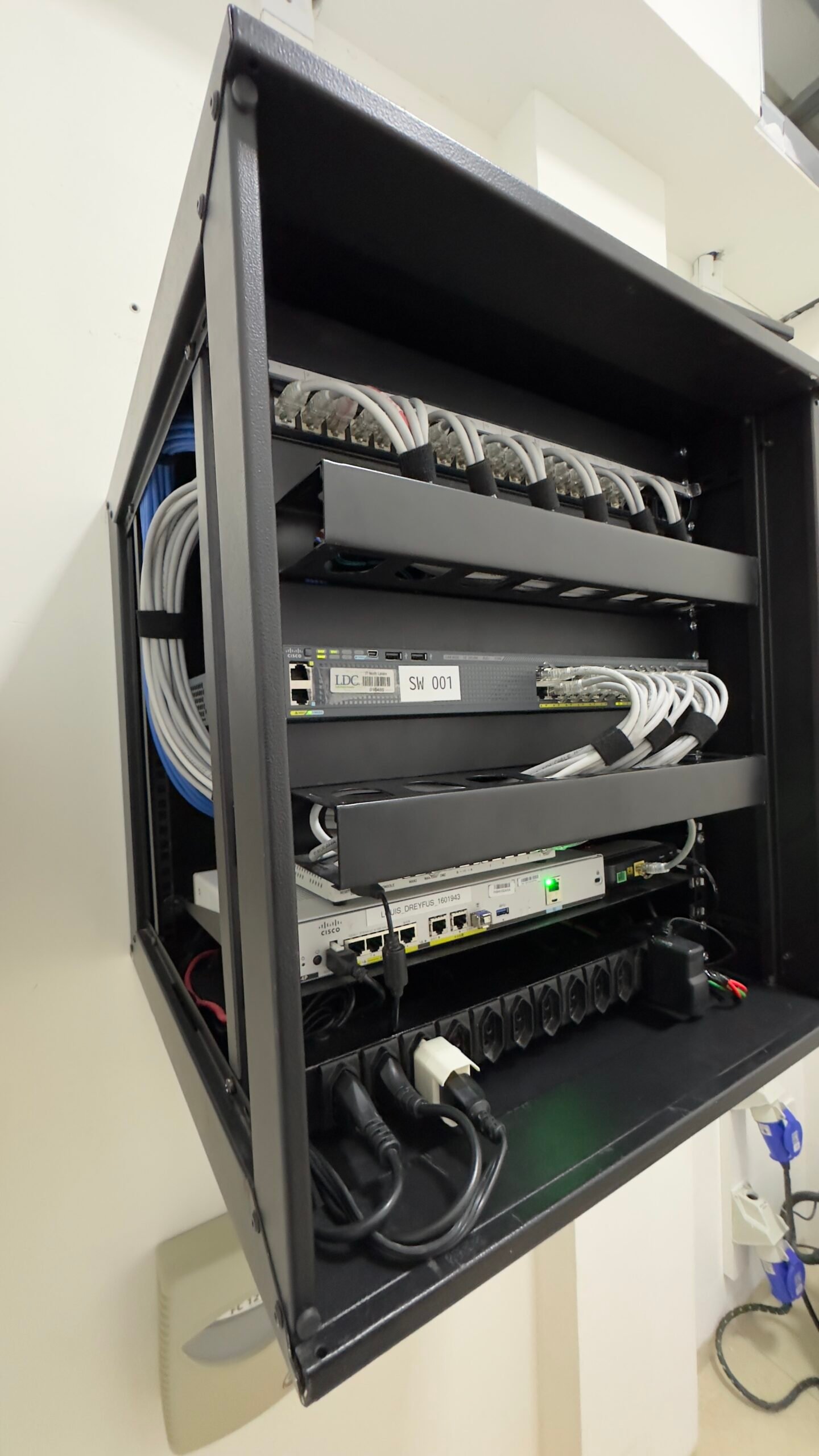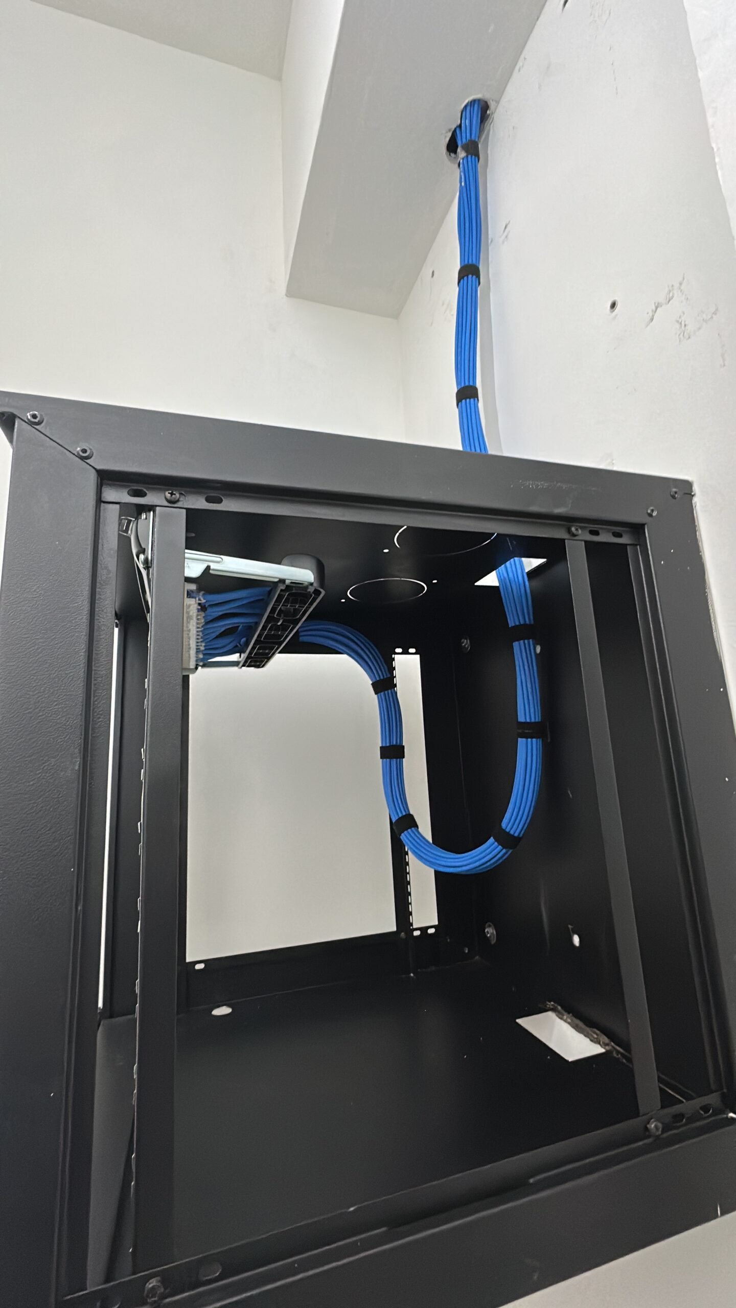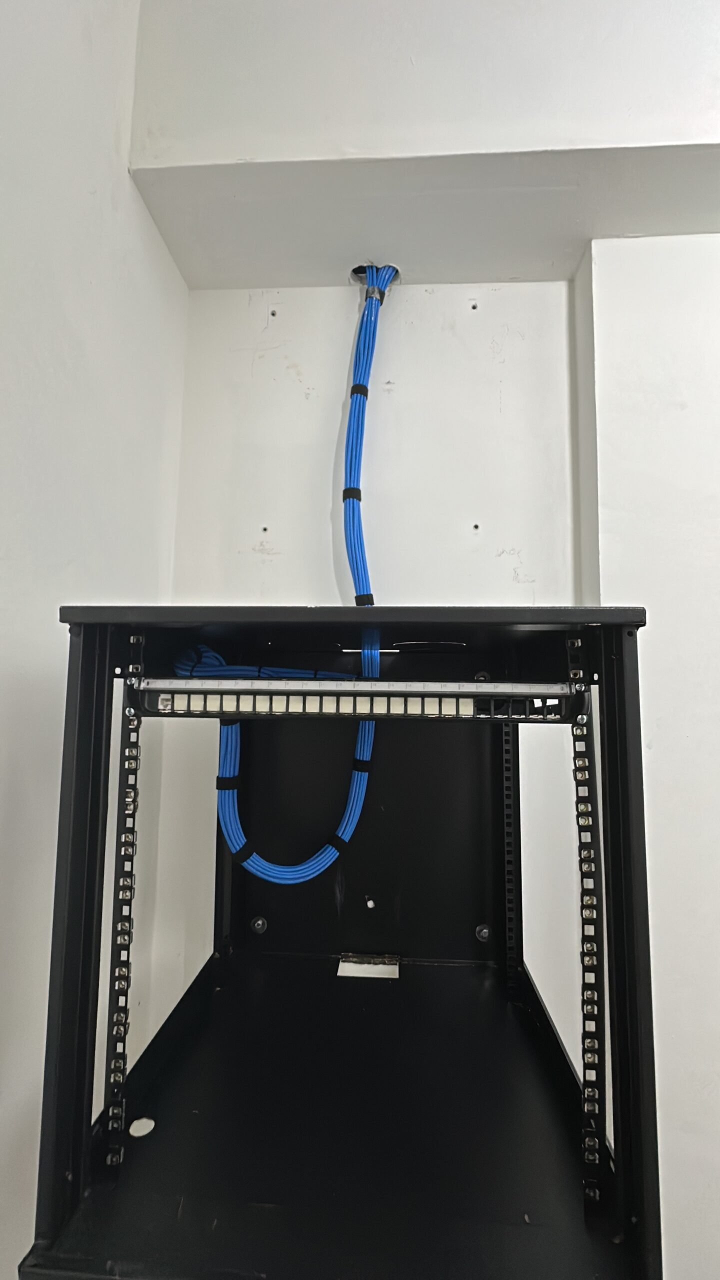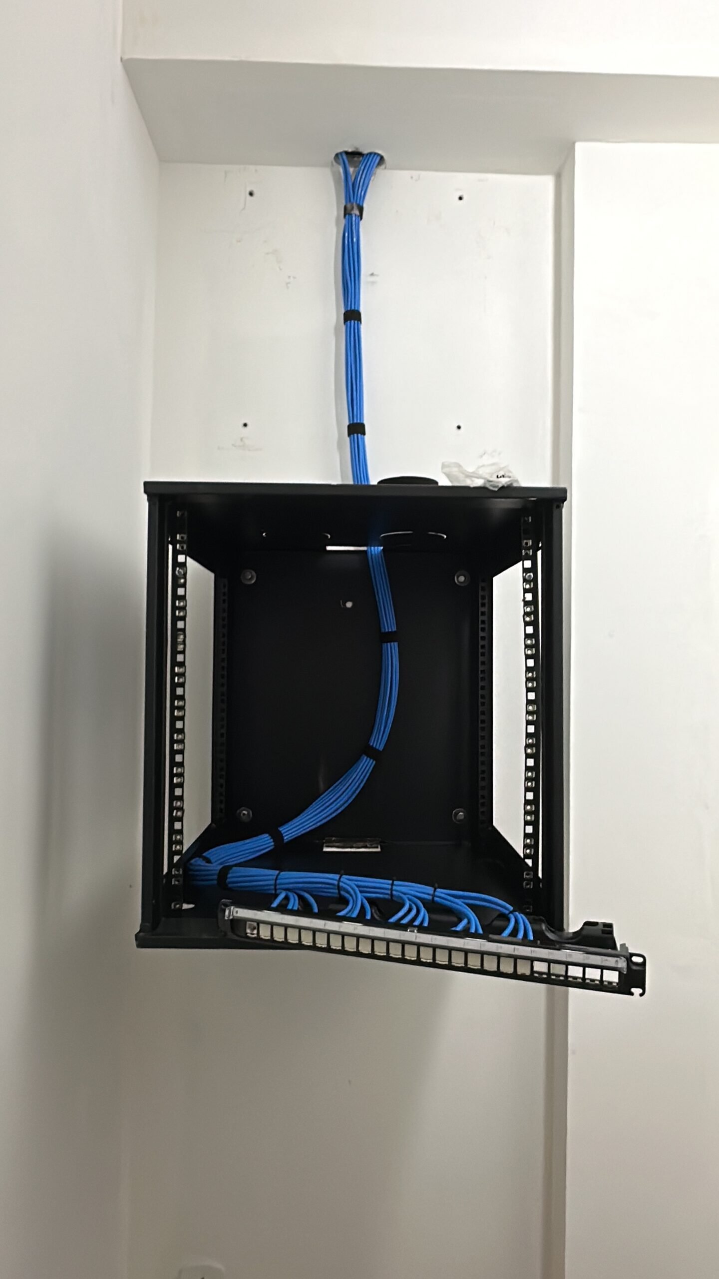 * Realizada a instalação do rack de parede e chegada do cabeamento UTP no interior do rack.