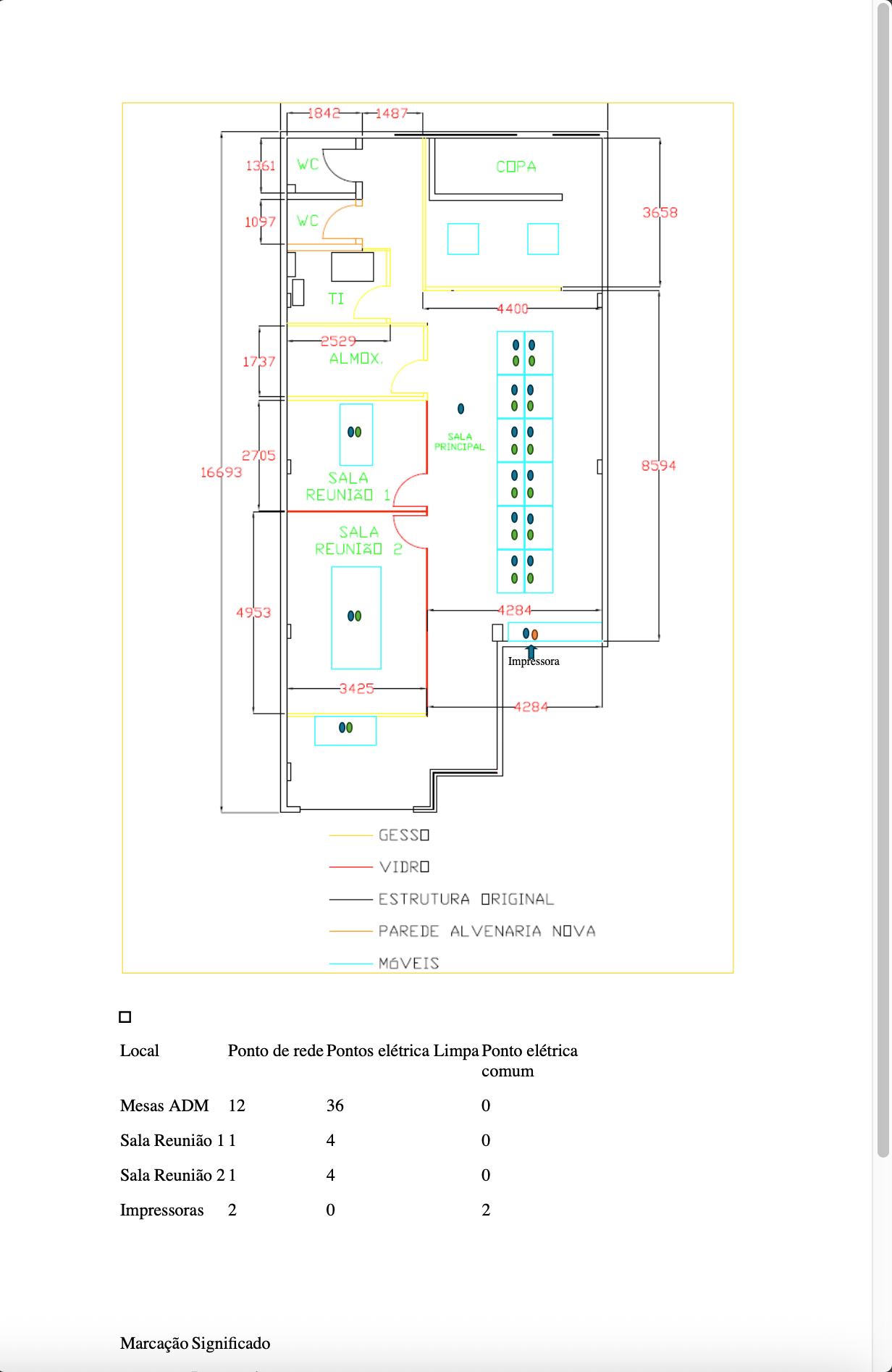 Obs. Devido à empresa responsável que realizou a retirada dos cabeamentos UTPs, elétrico e infra. Não foi possível a reutilização do material já existente do escritório. Sobre as canaletas de dutotec e conexões, todas foram descartadas (informação passada por Geazi Igor, responsável pela retirada da infra e cabeamento).